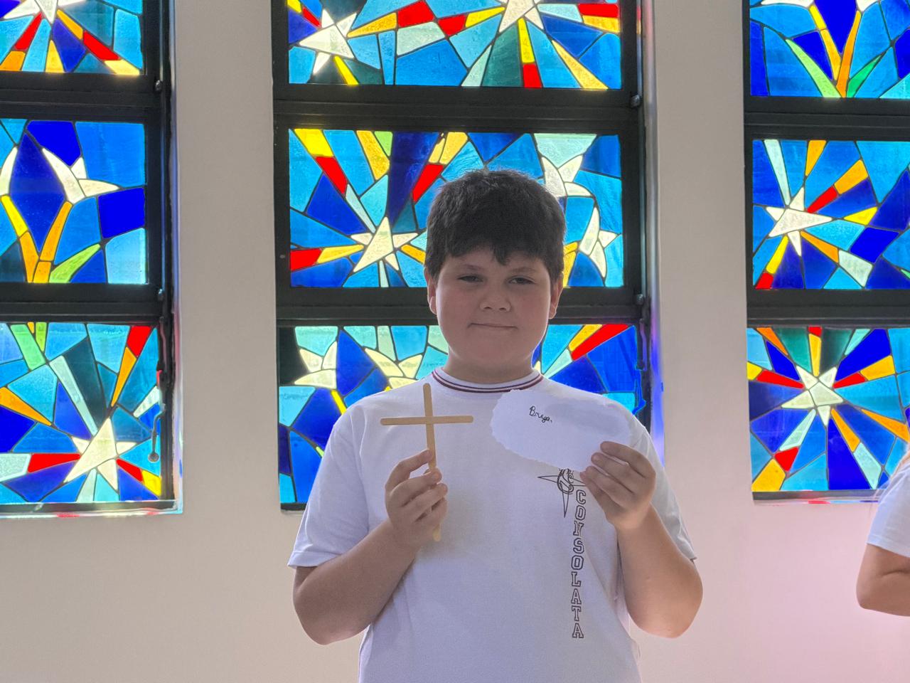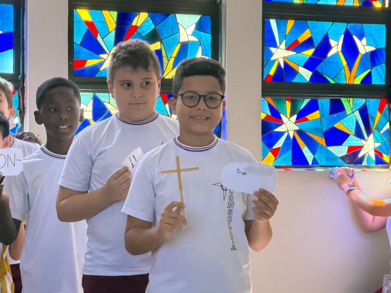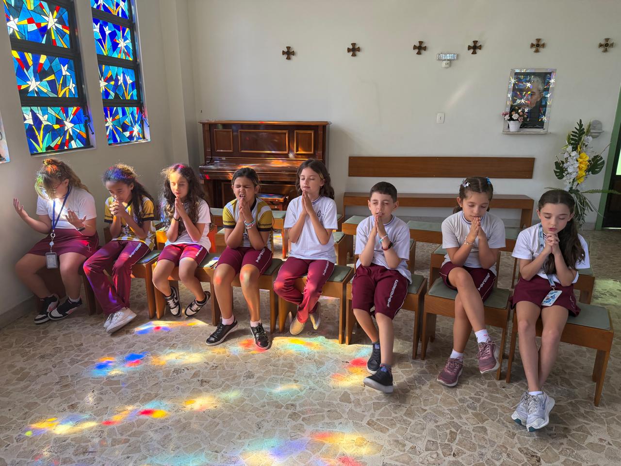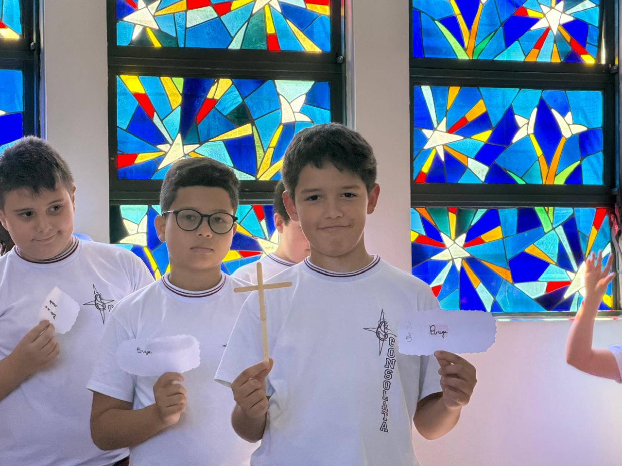 Os alunos do 4º ano participaram de uma assembleia na capela Consolata com o tema renovação, em razão da ressurreição de Jesus.