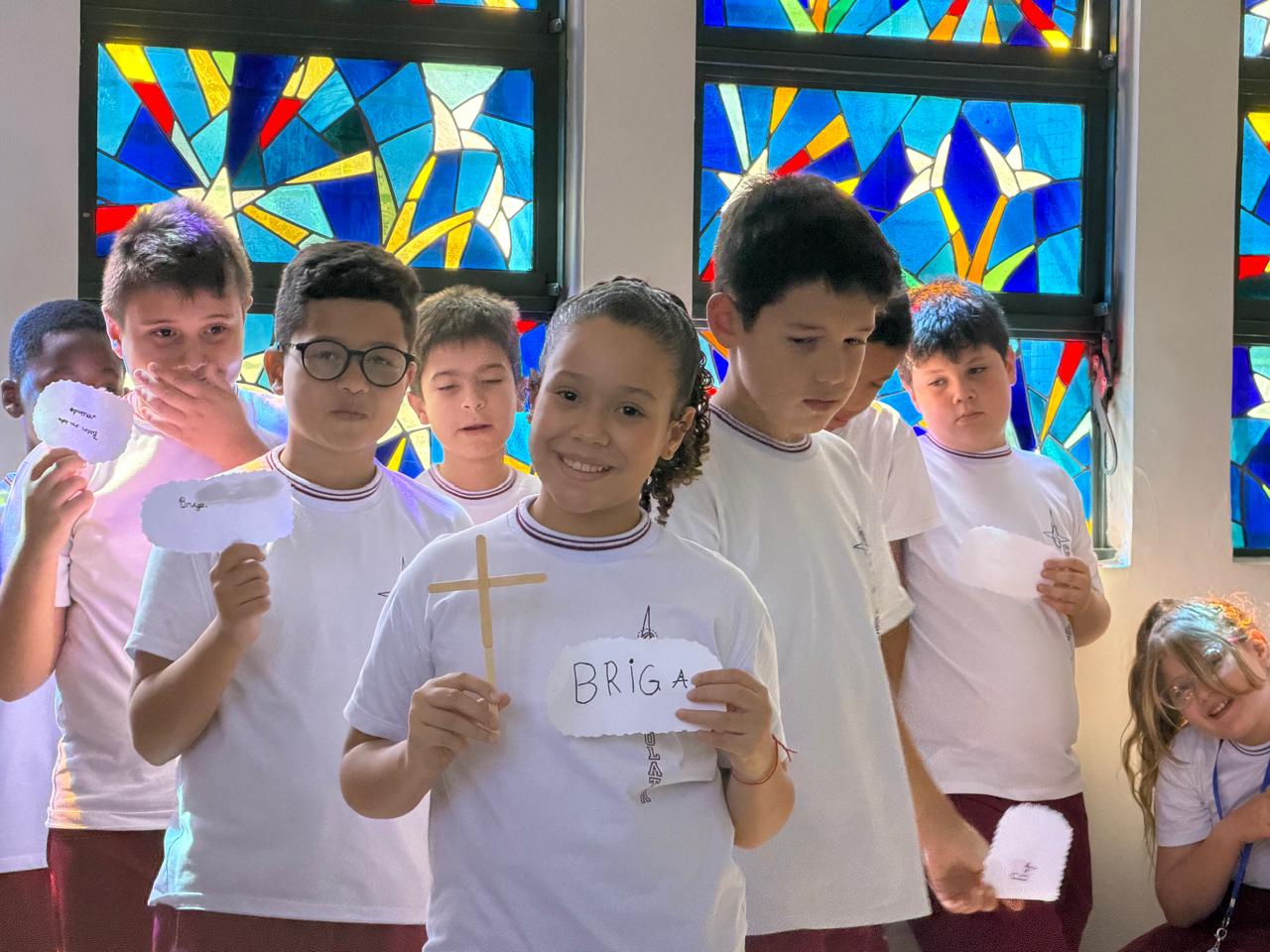 Durante esse momento, cada criança refletiu sobre um sentimento que gostaria que não existisse mais em nossa sociedade, expressando o desejo por uma vida nova, pautada no amor, no respeito e na esperança.