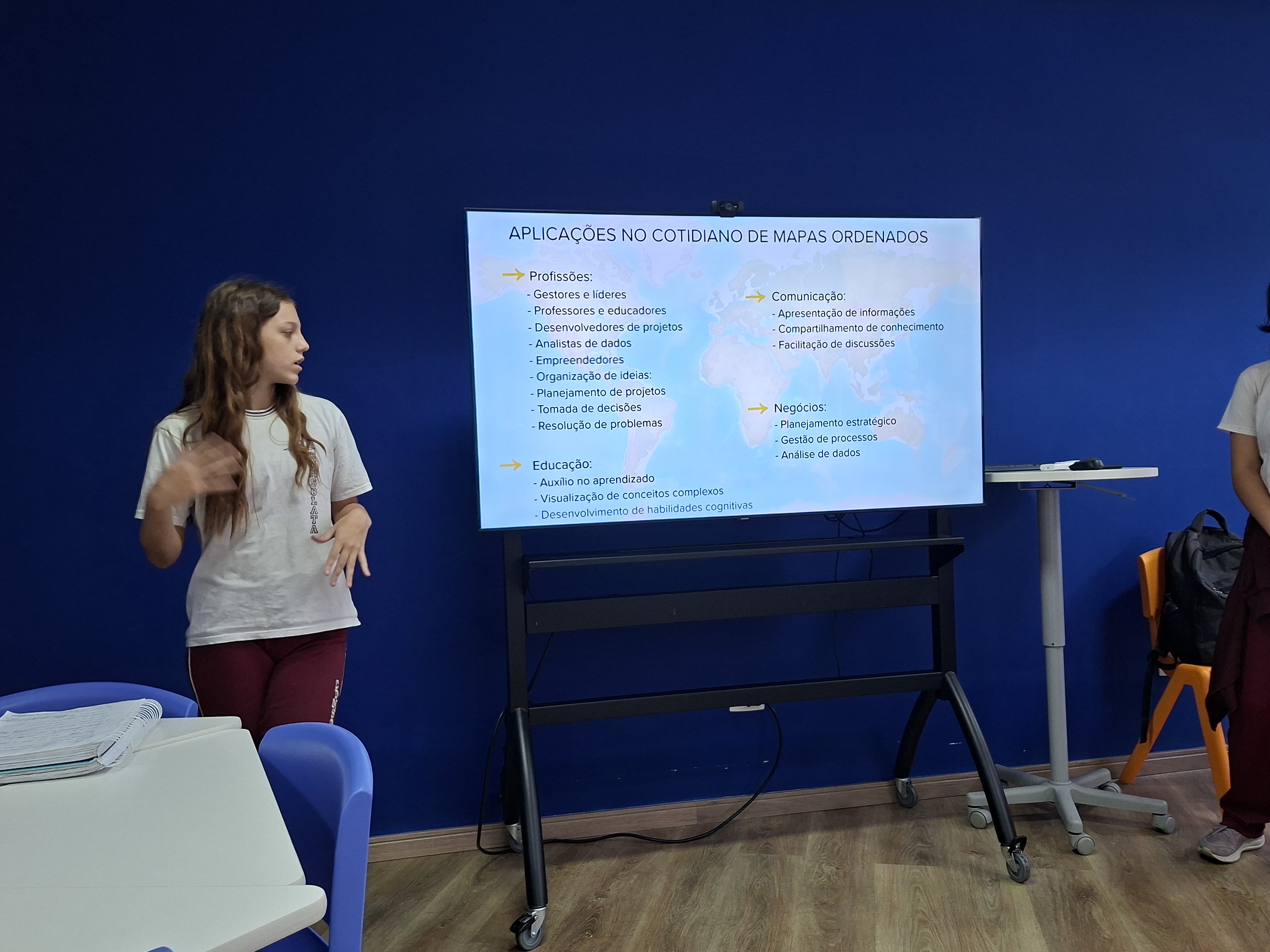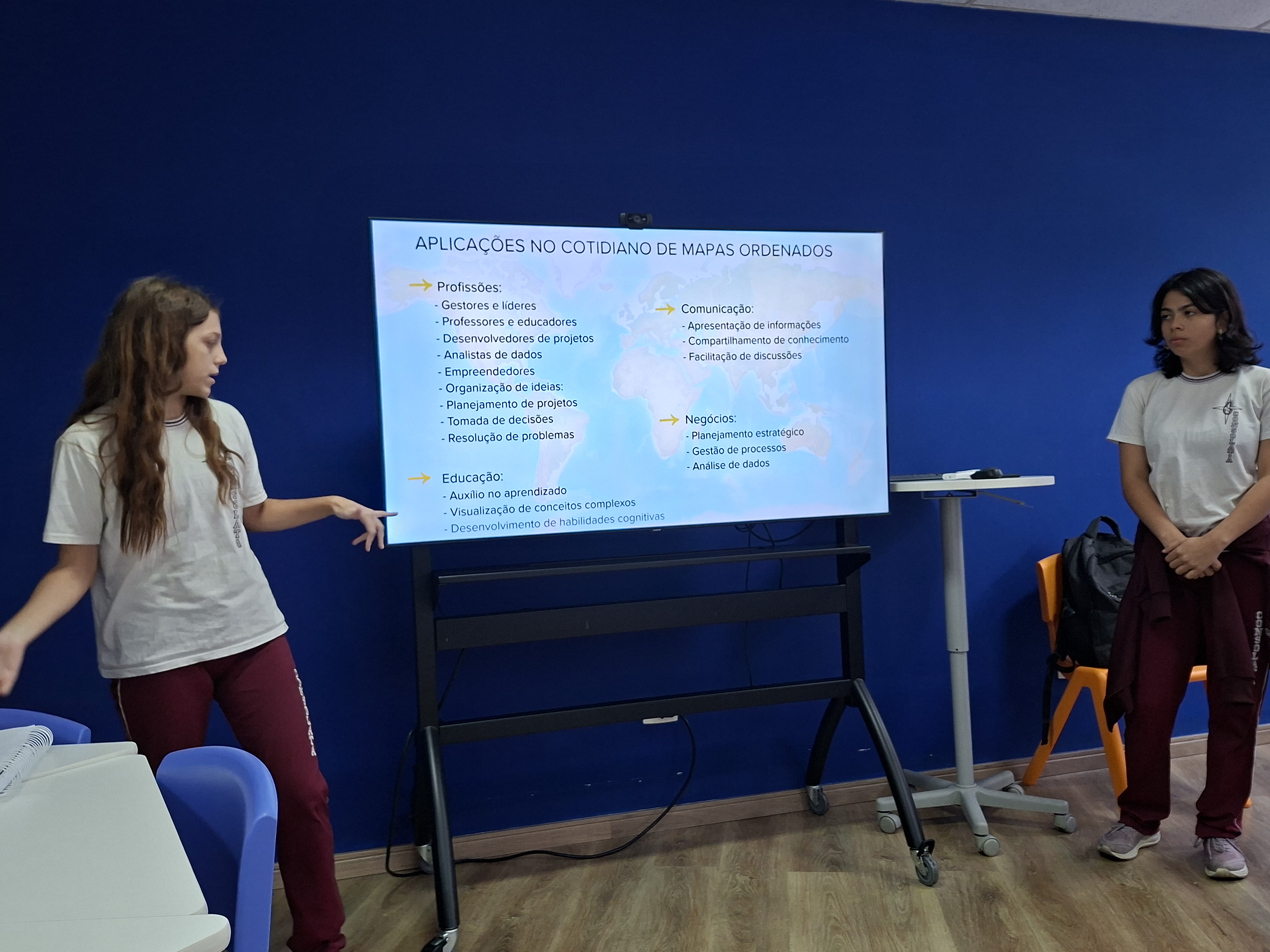 Além das apresentações, os alunos também desenvolveram mapas mentais digitais, organizando de forma visual os principais conceitos estudados e compartilhando o conhecimento com a turma.