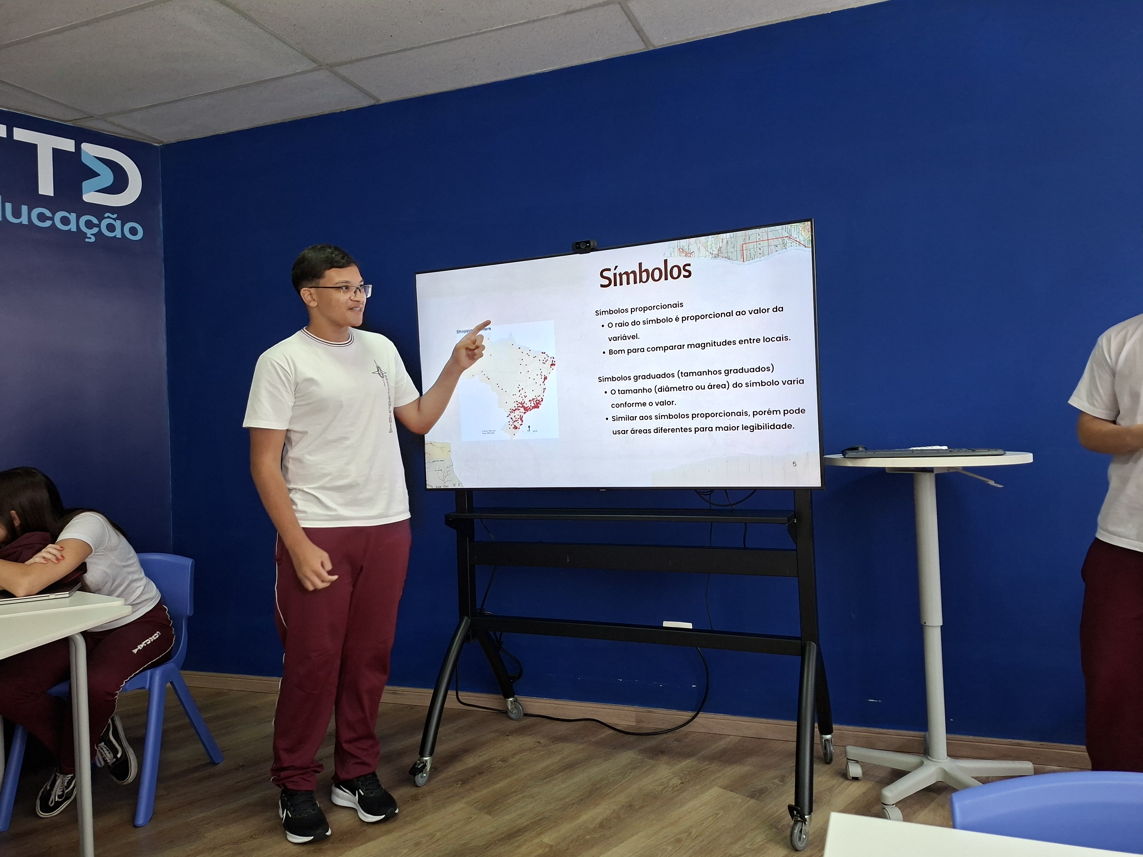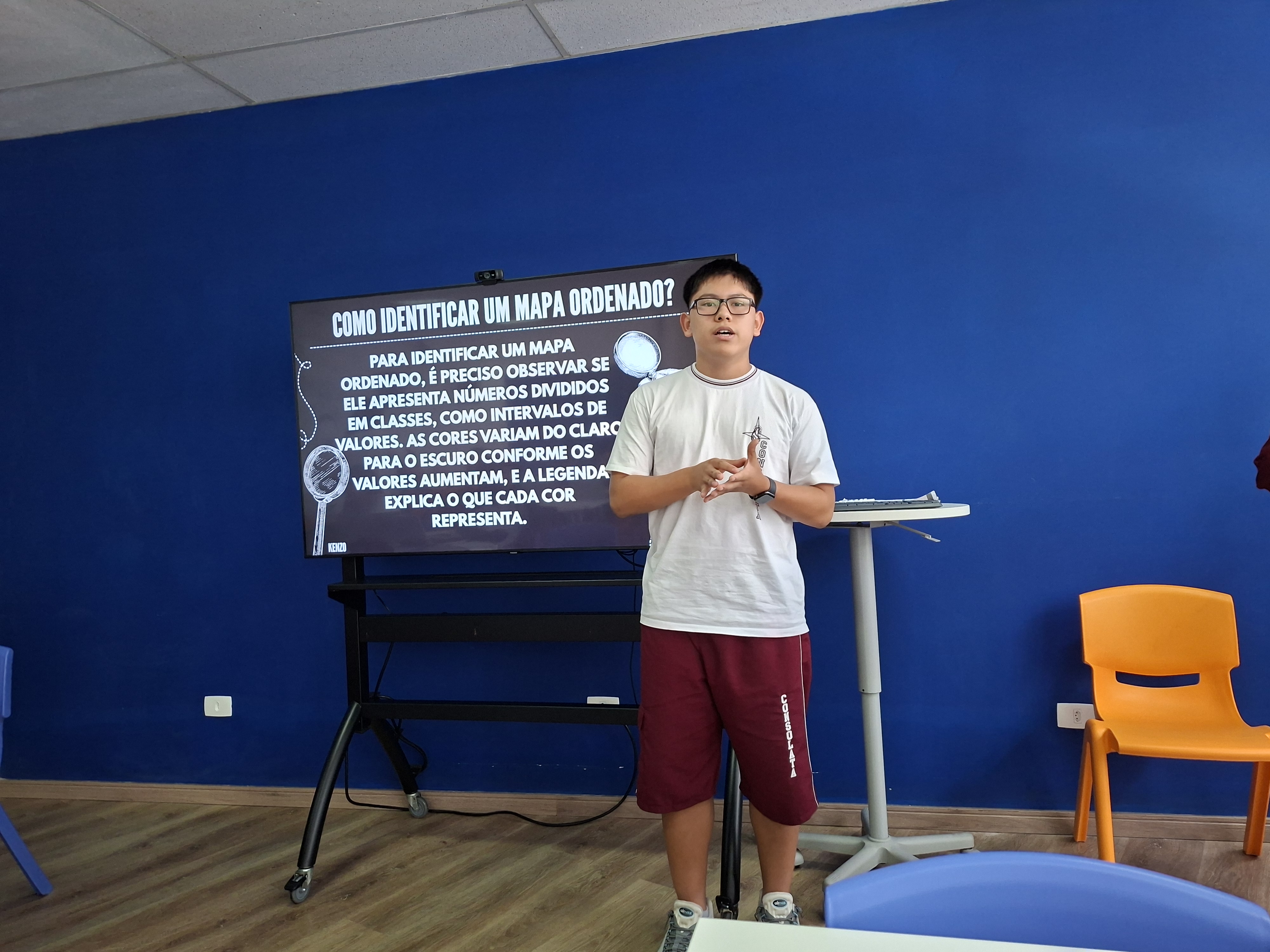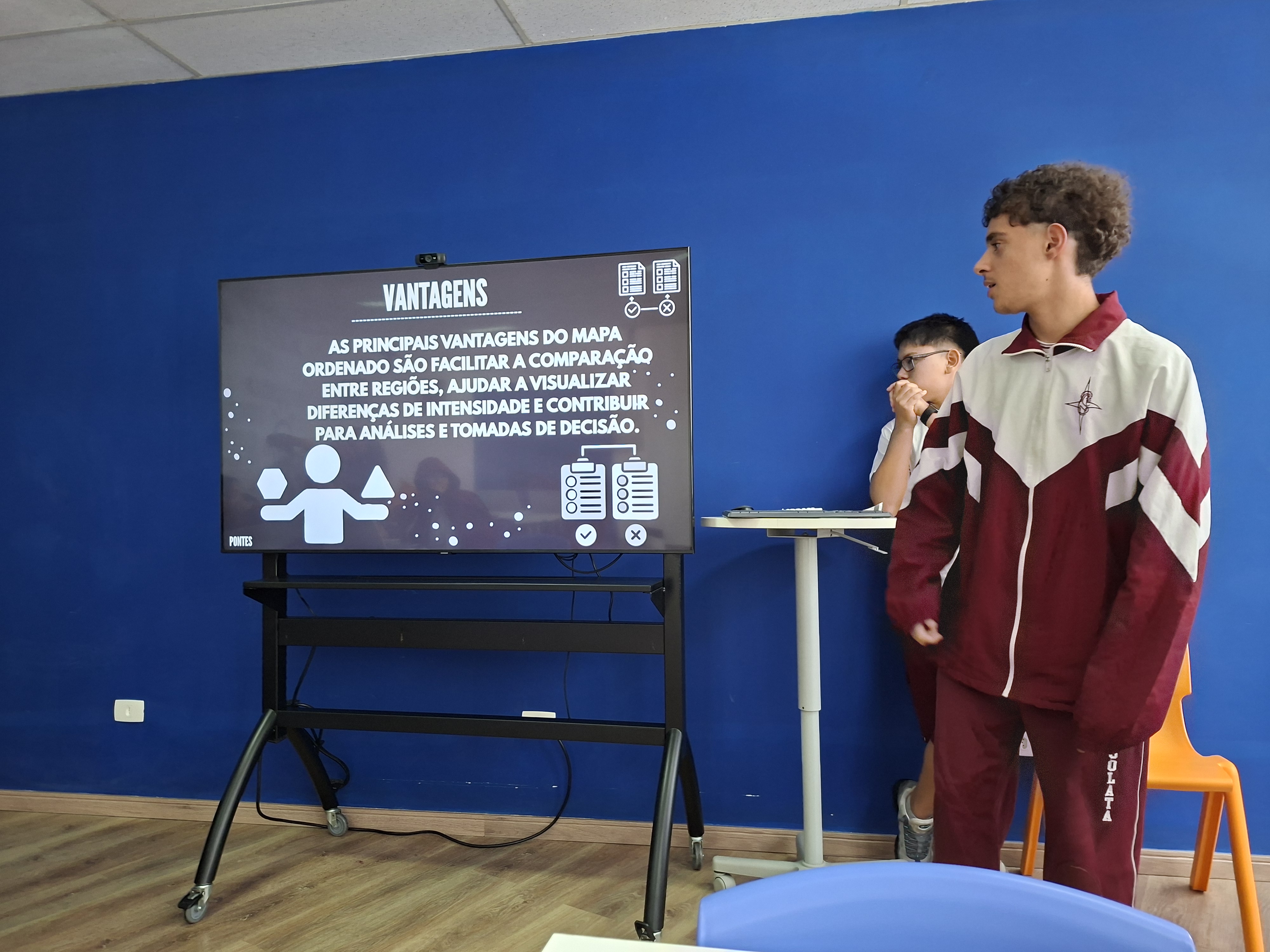 Durante a atividade, os estudantes investigaram diferentes formas de representação cartográfica, explorando mapas qualitativos, quantitativos, ordenados, hipsometria, curvas de nível e anamorfose. A proposta foi compreender como os mapas ajudam a explicar fenômenos do nosso mundo, como população, relevo e organização do espaço geográfico.