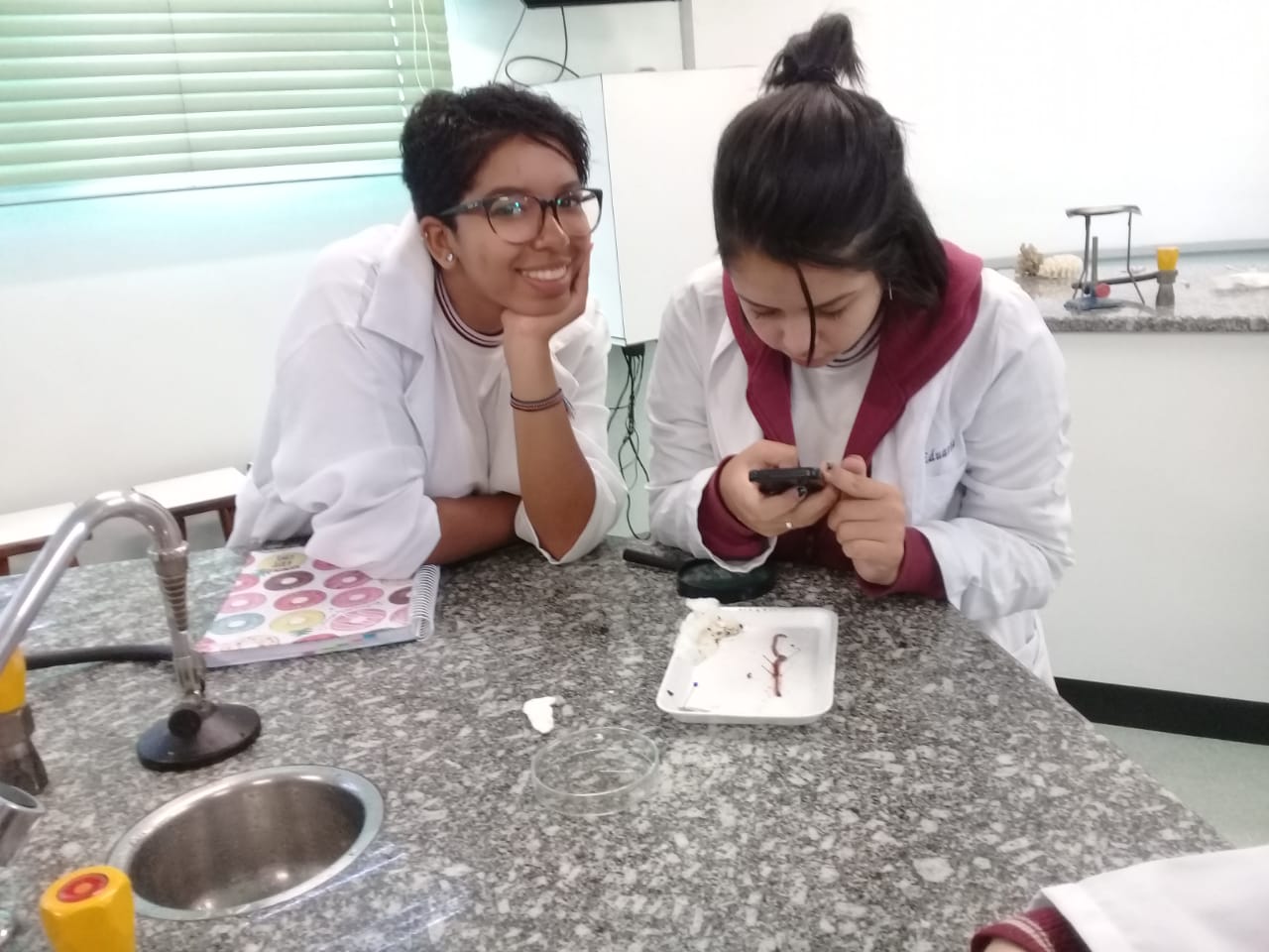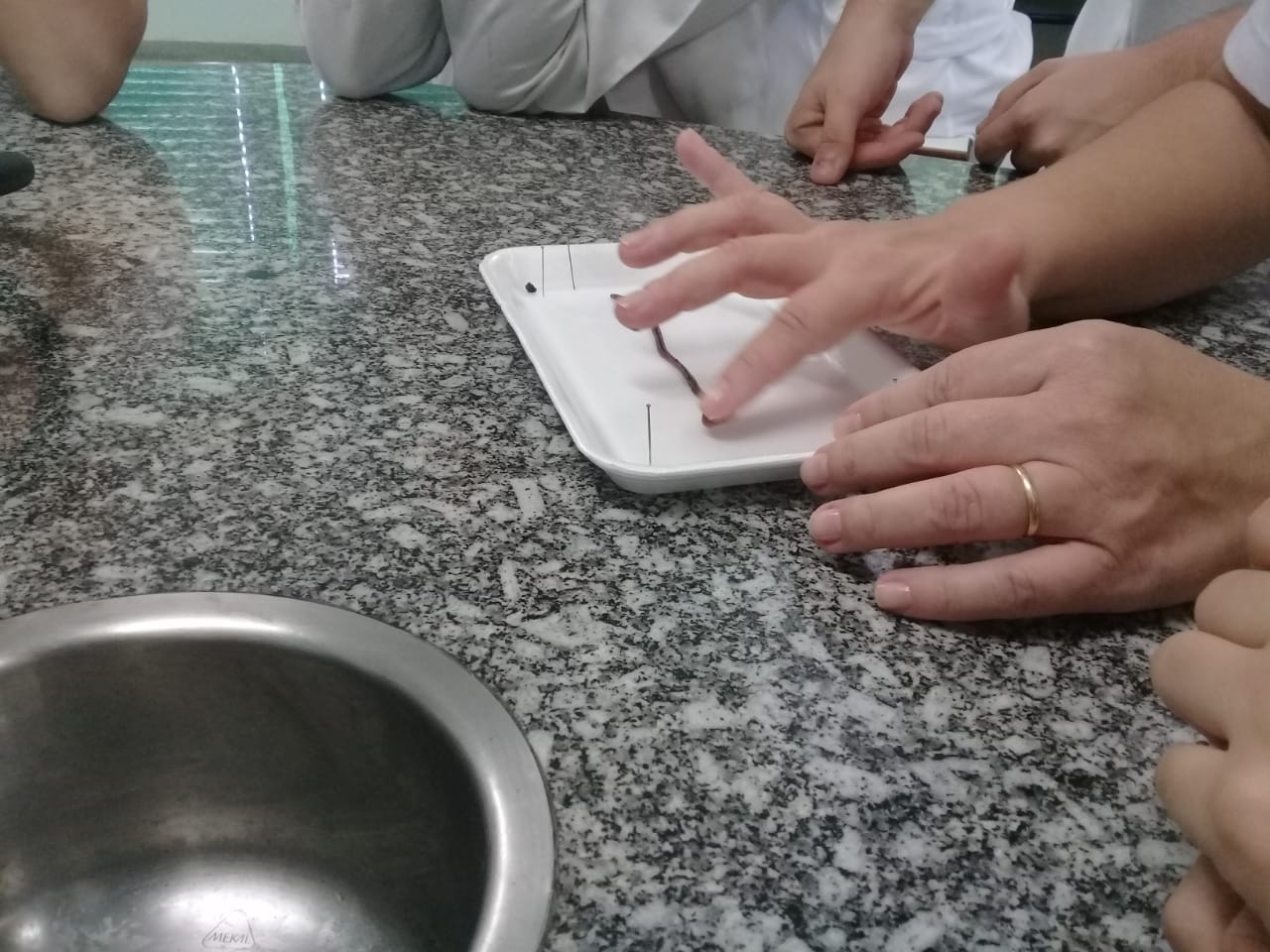 Observação e dissecação de anelídeos, acompanhados pela Profª Mariana de Biologia.
