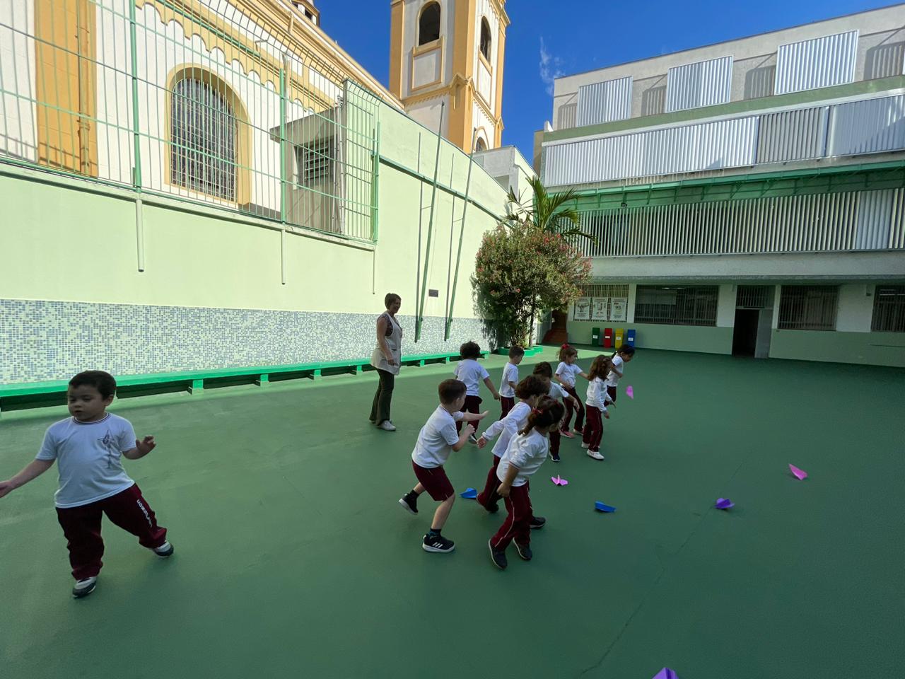 Após o estudo sobre meios de transporte aéreos, os alunos confeccionaram um avião de papel e brincaram que estavam viajando para um destino escolhido pela turma.