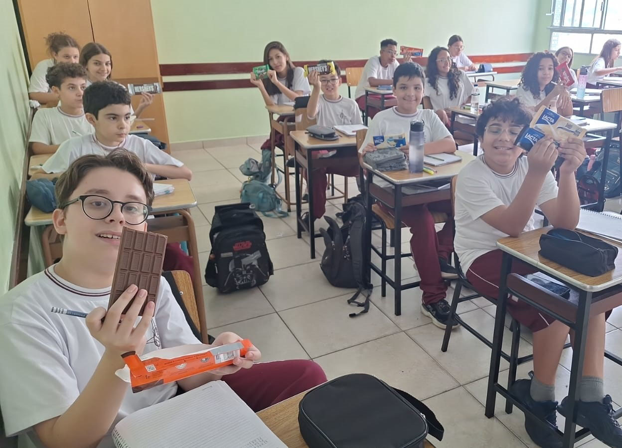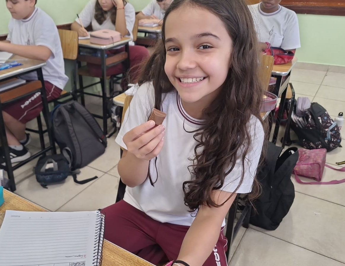 Os alunos copiaram os exercícios no caderno e tinham que comer a quantidade de quadradinhos que cada exercícios solicitava. Eles curtiram bastante essa aula, vários sugeriram repetir esse tipo de atividade.