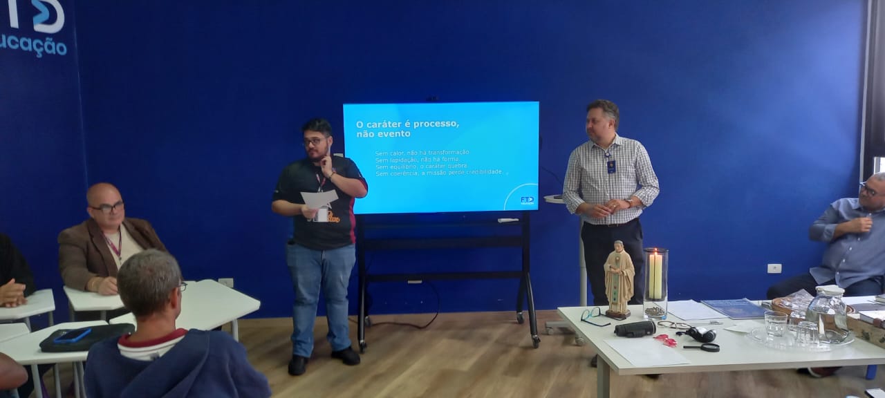A manhã formativa contou com a presença dos assessores da FTD Educação, iniciando com o professor Júlio Souza, teólogo e assessor de identidade, missão e vocação, que conduziu a reflexão sobre o Currículo Evangelizador e a Metodologia-CHAVE, à luz do carisma missionário allamaniano e do horizonte da construção da nova Proposta Político-Pedagógica para o período de 2026 a 2029. Na sequência, tivemos a contribuição de Vitor Divino, coordenador de Relacionamento Institucional Confessional do Integra – FTD Educação, que dialogou com os funcionários, reforçando a compreensão de que a missão educativa envolve toda a comunidade escolar.