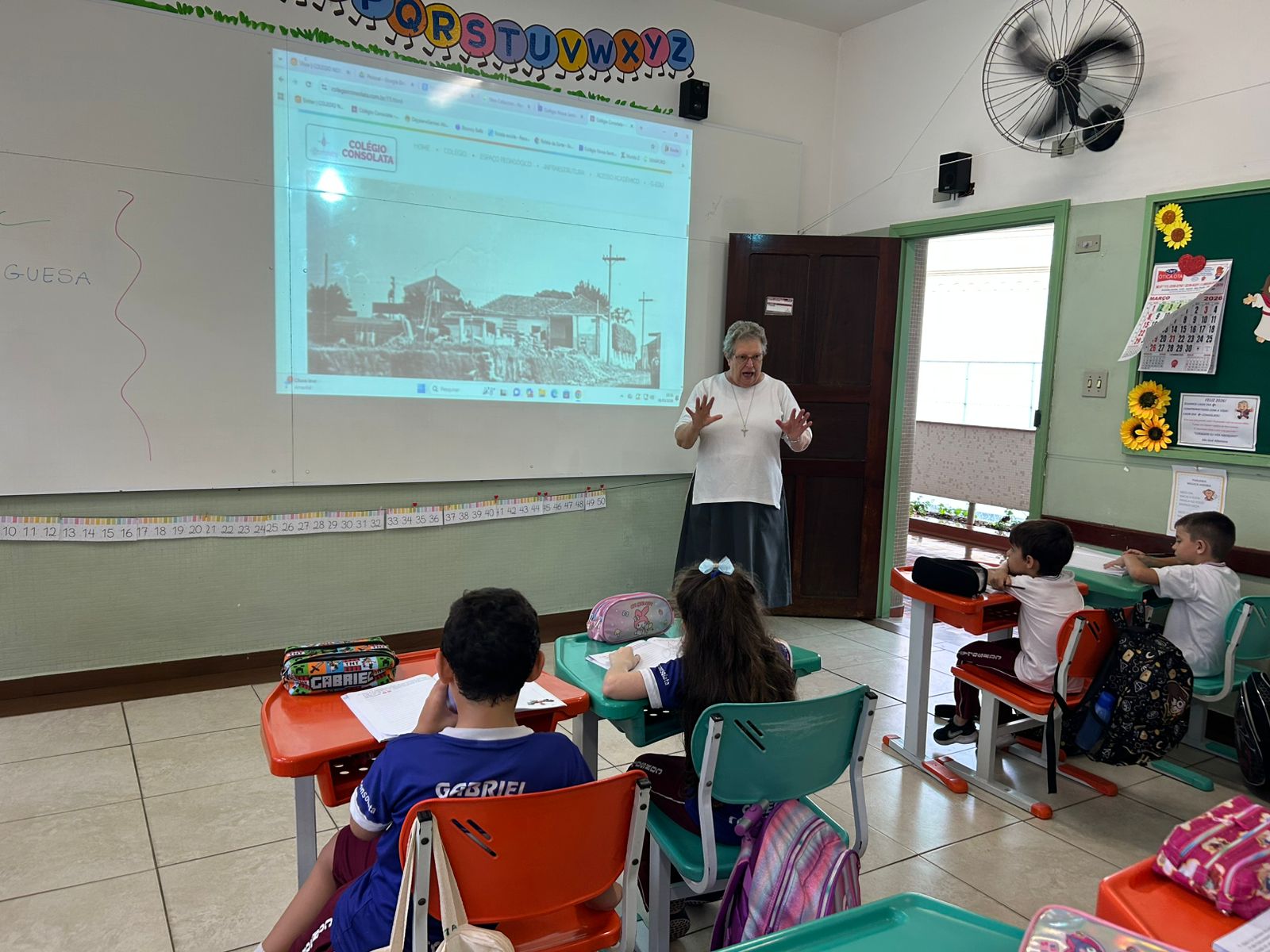 Os alunos do 1º ano A tiveram a oportunidade de conhecer um pouco mais sobre a história da nossa escola por meio de um momento muito especial, com a presença da nossa diretora, Irmã Irilda.