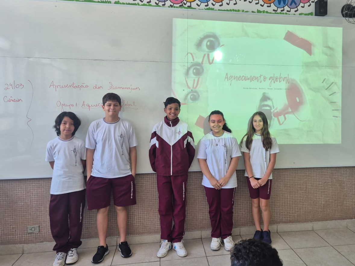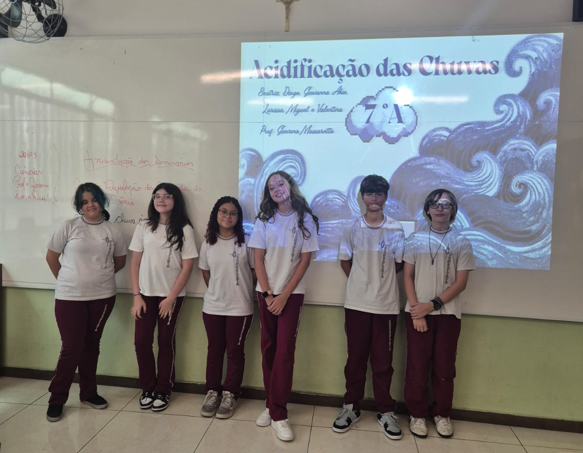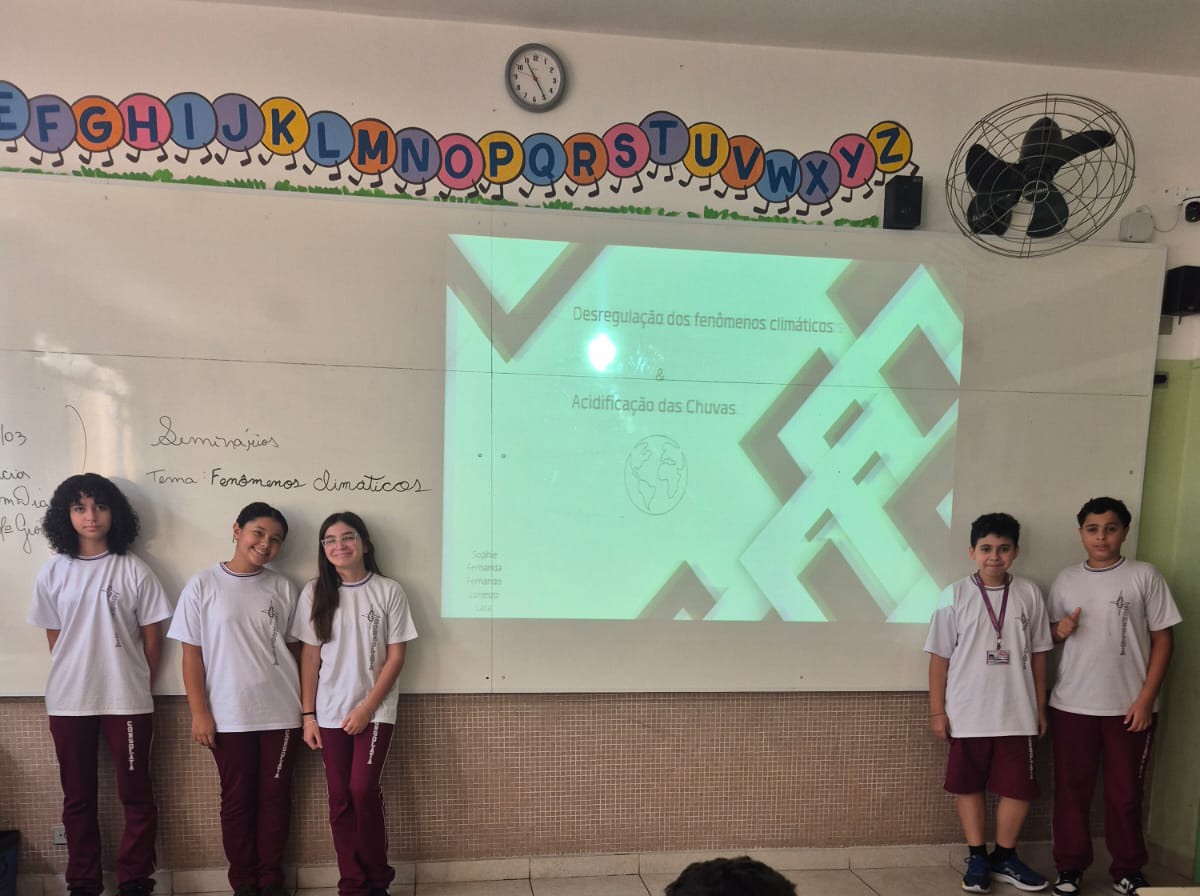 Os alunos dos 7º anos A e B, na disciplina de Ciências, orientados pela professora Giovana, protagonizaram um momento de grande aprendizado ao apresentarem seminários sobre temas atuais e de extrema relevância ambiental, como aquecimento global, aquecimento dos oceanos, desregulação dos fenômenos climáticos e chuva ácida.