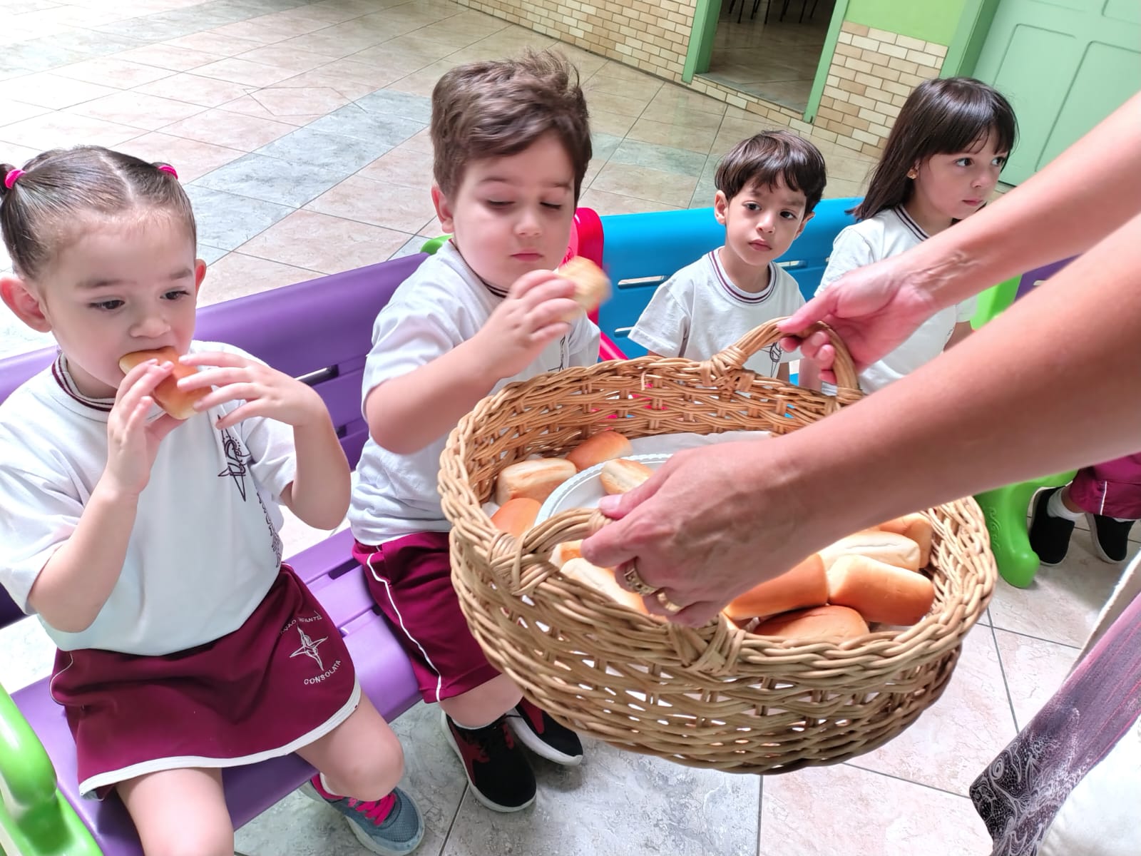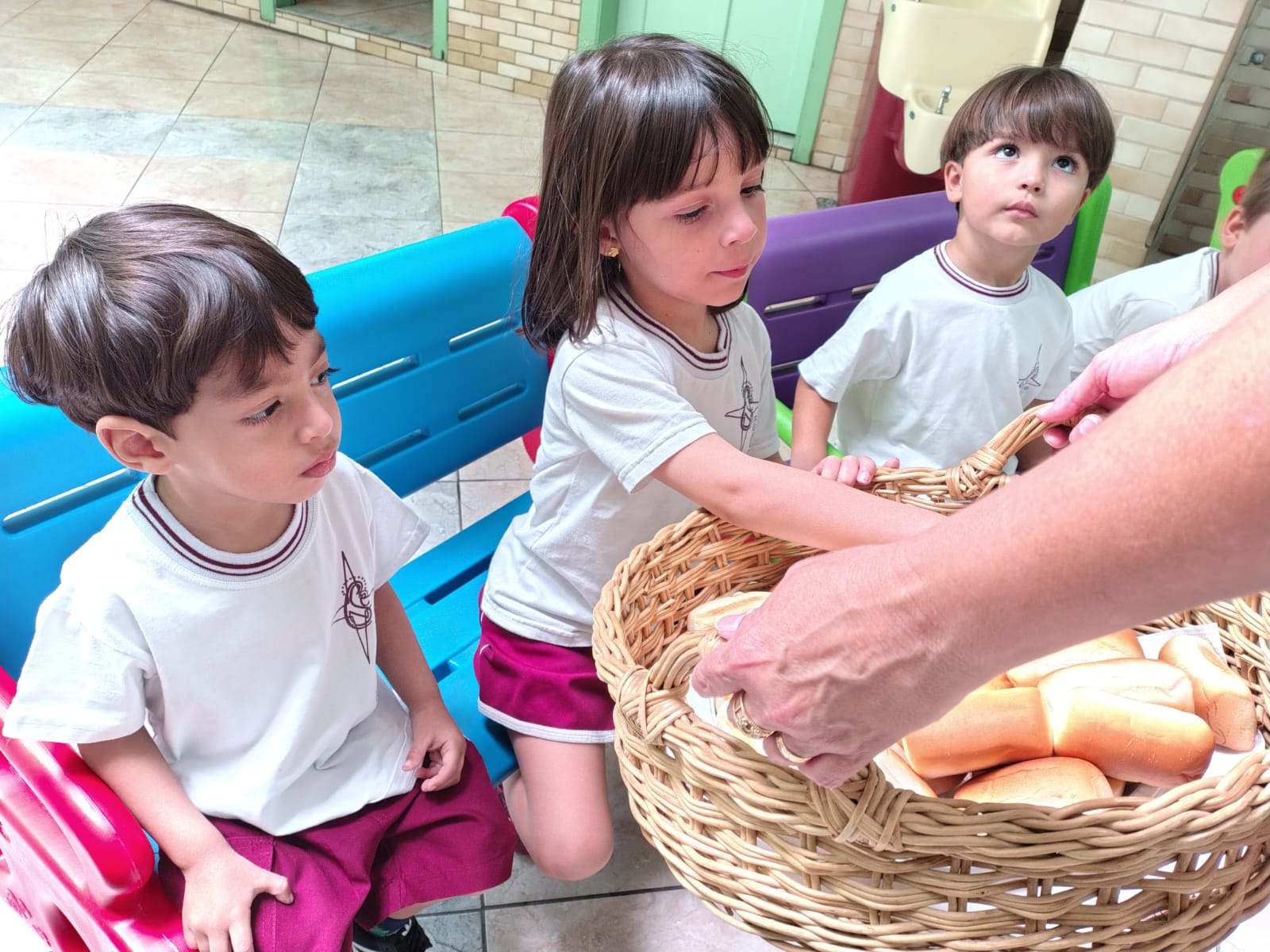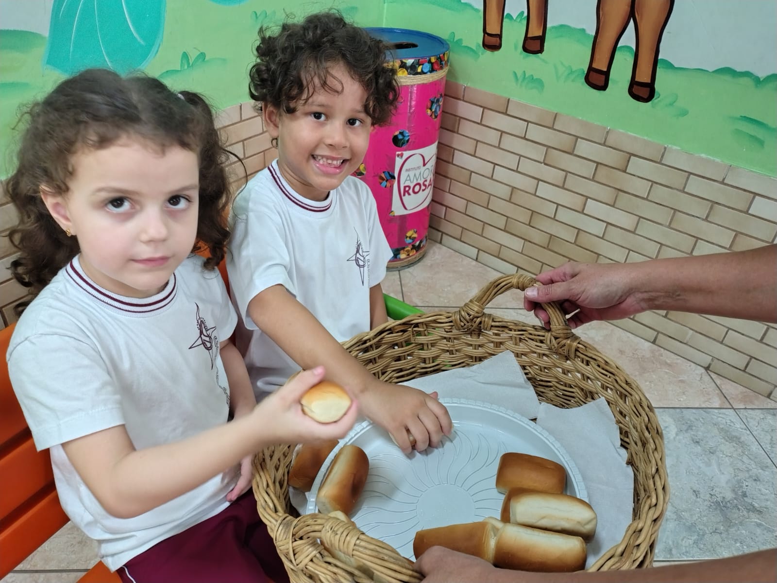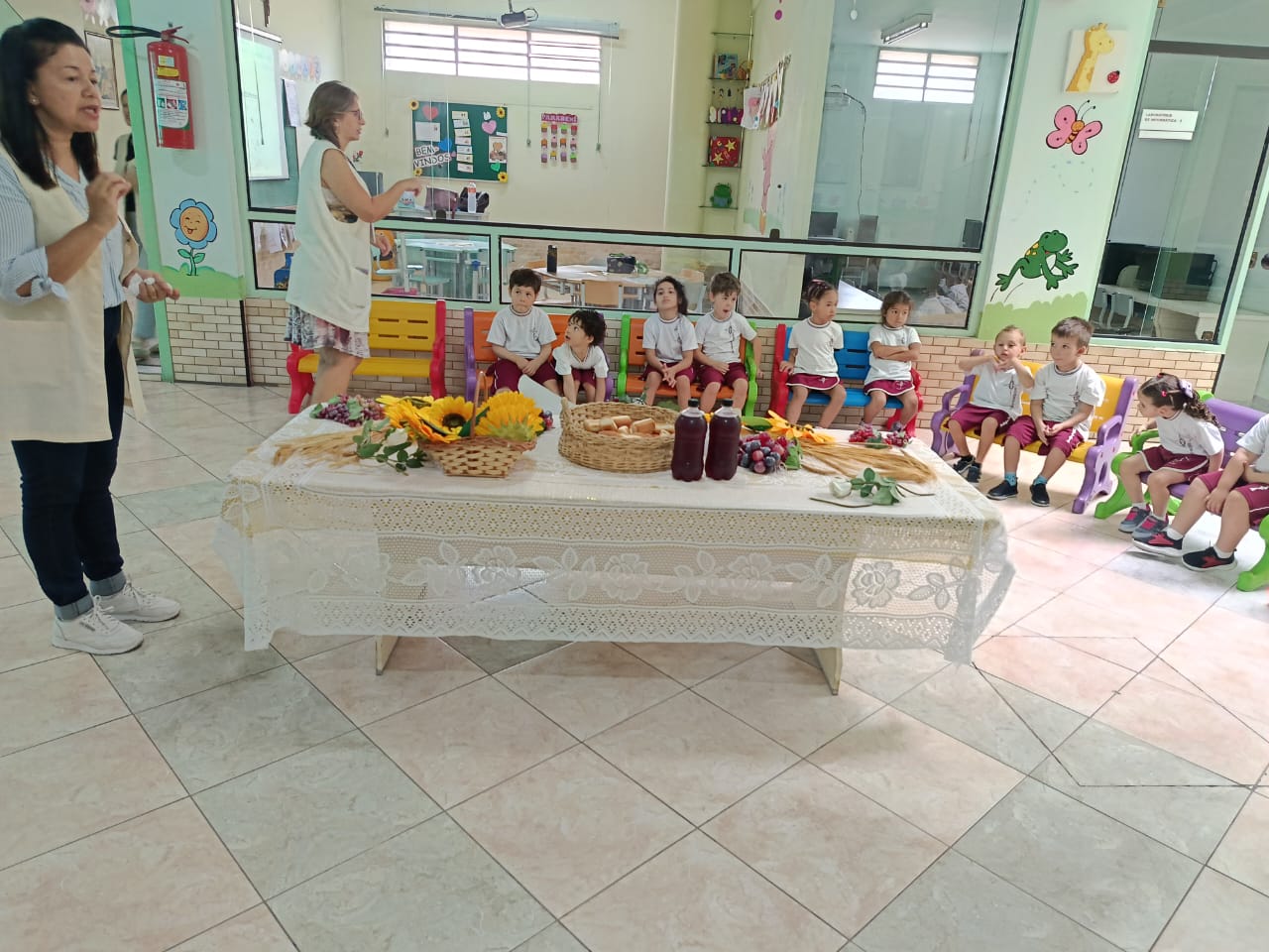 Para enriquecer esse aprendizado, apresentamos os símbolos da Páscoa e contamos a história da Última Ceia, destacando seus significados e ensinamentos. O pão e o vinho, juntamente com os demais símbolos, ajudaram os alunos a compreenderem, de forma simples e sensível, a importância desse momento sagrado.