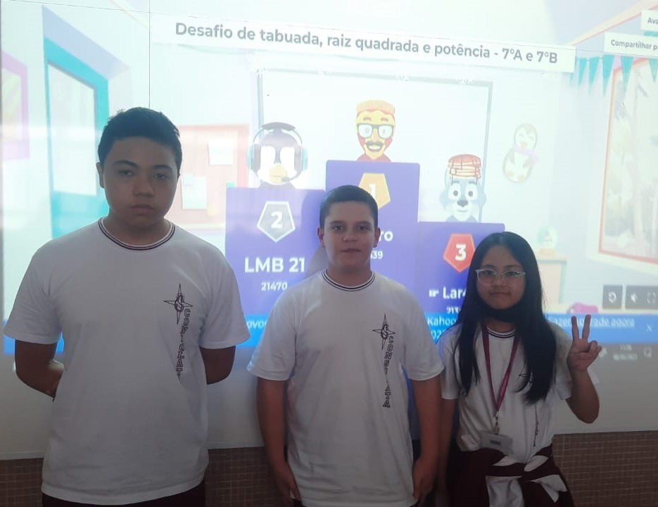 Desafio de tabuada, raiz quadrada e potência com os alunos dos 7ºs anos, nas aulas da Prof. Érica.