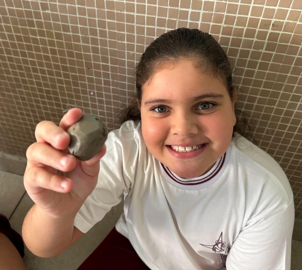 Para encerramento do conteúdo fizeram uma experiência, reproduzindo fósseis com argila. Foi bastante divertido.