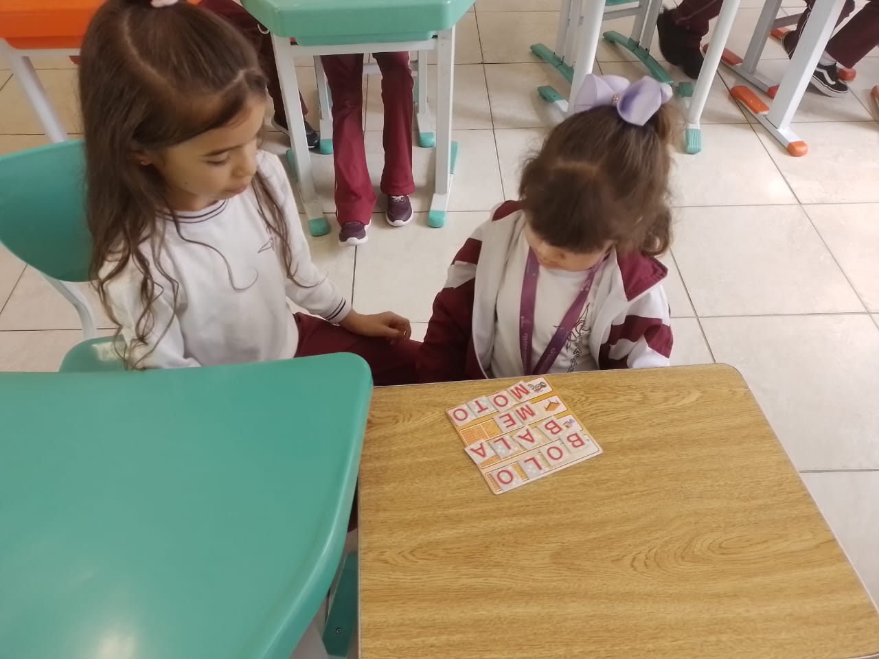 Os alunos dos 1º anos estão participando da atividade nomeada "Rodízio alfabético" que auxilia no processo de alfabetização, onde eles são organizados em grupos baseados em seus níveis de aprendizagem e participam de atividades de leitura e escrita em esquema de rodízio com as professoras da sala.
