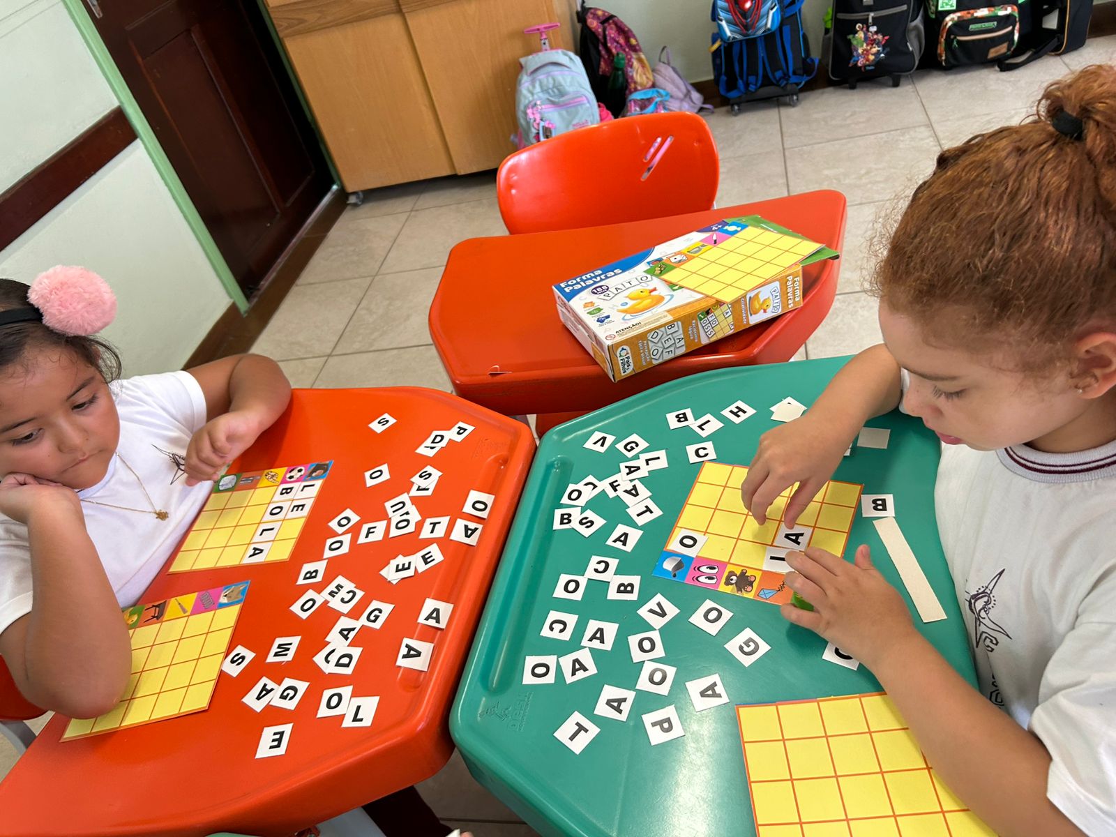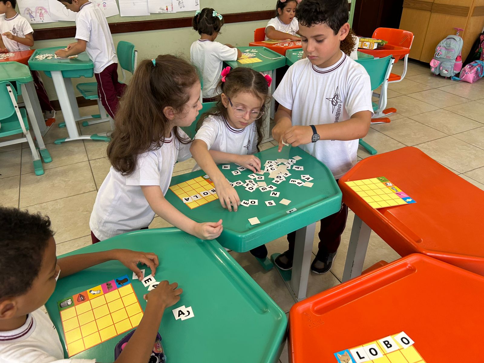 Em grupos, os alunos do 1º ano A, exploraram as letras móveis, montando palavras, trocando ideias e fortalecendo a leitura de forma lúdica e colaborativa.