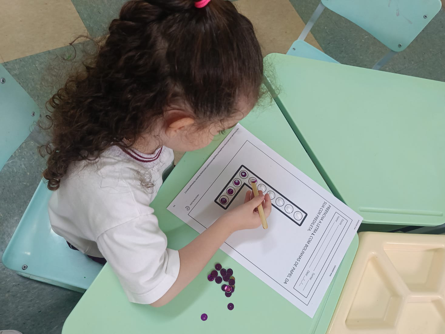 Utilizando cola e lantejoulas e palito de sorvete, os alunos "pescavam" com atenção as lantejoulas e colavam nas letrinhas. Eles adoraram e estão evoluindo a cada dia em seus conhecimentos.