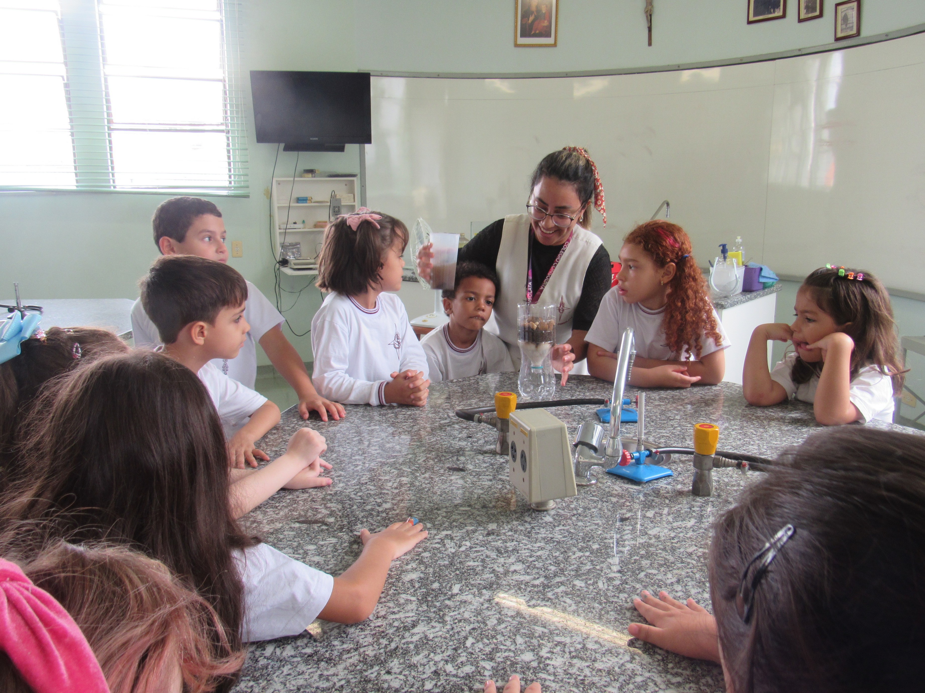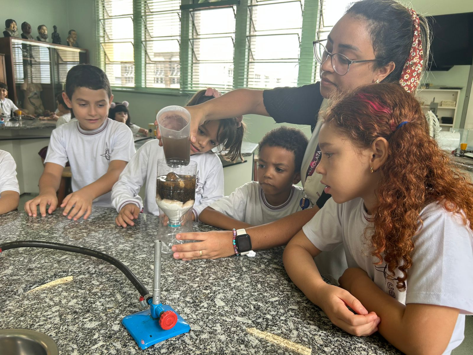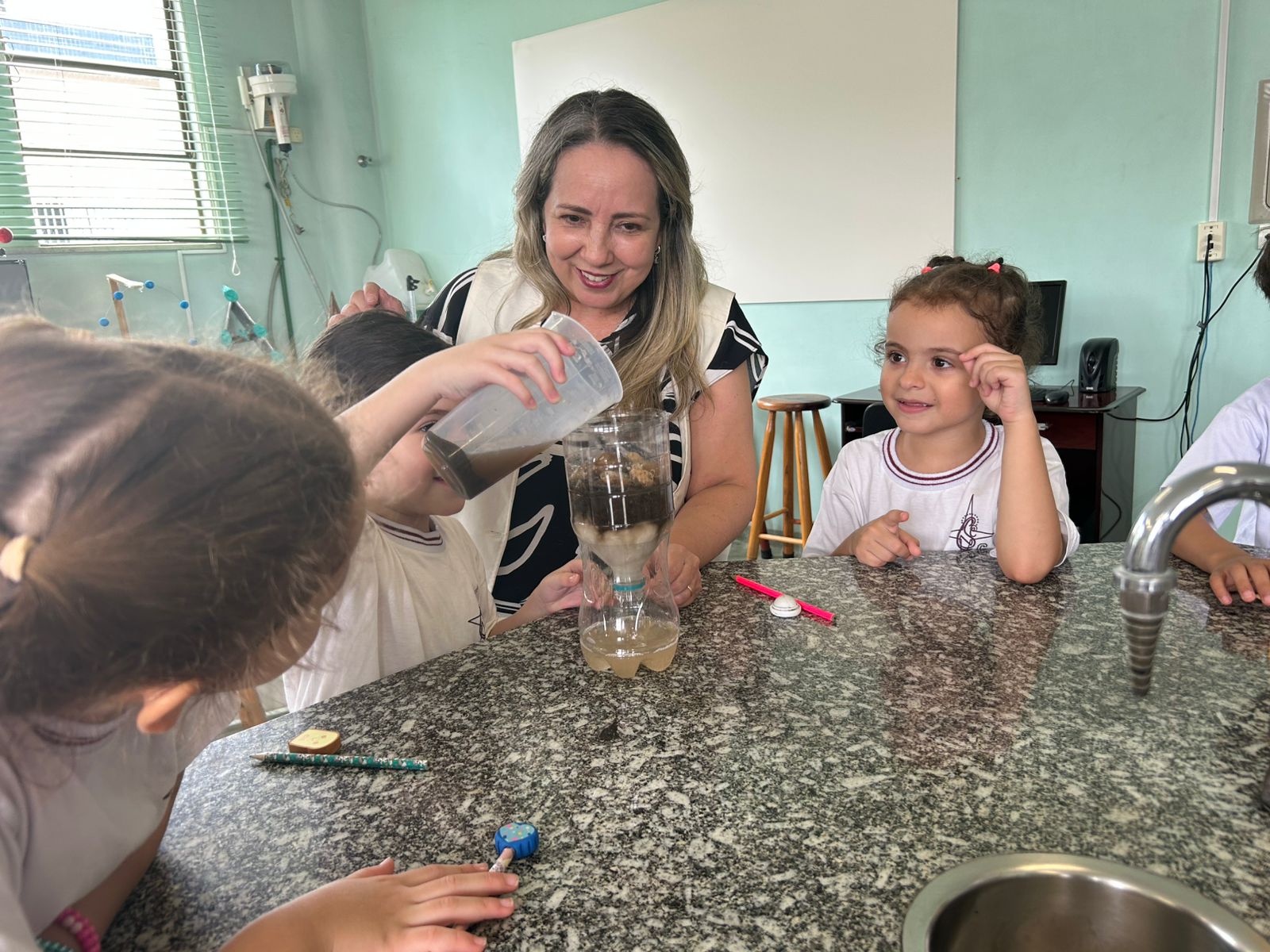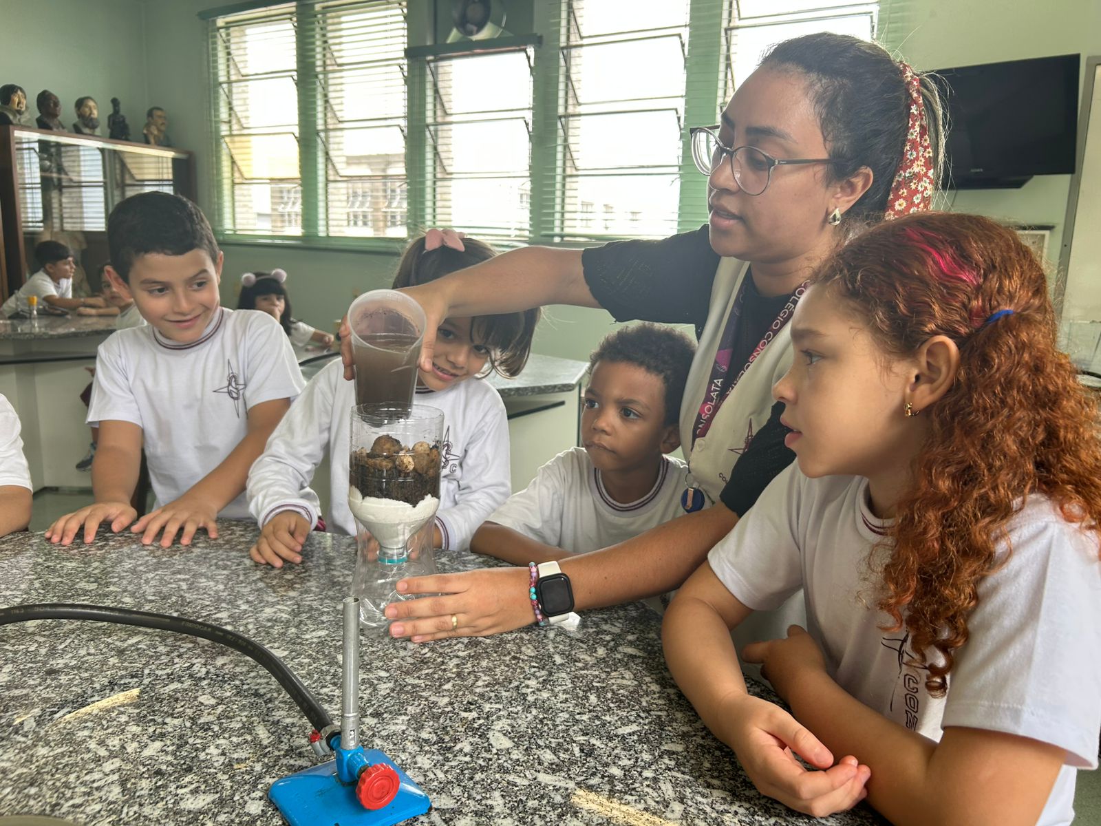 Em comemoração ao Dia da Água, os alunos do 1º ano A e B aprenderam sobre o processo de filtragem da água por meio de uma experiência prática no laboratório de ciências.